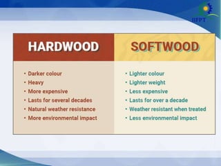 This document discusses various carpentry tools, wood types, and wood joints. It provides details on try squares, steel rules, marking gauges, coping saws, tenon saws, and wood planes. It also describes manufactured wood materials like MDF and plywood. Finally, it examines common wood joints like butt joints, edge joints, halving joints, housing joints, bridle joints, finger joints, mortise and tenon joints, dovetail joints, dowel joints, and mitre joints.