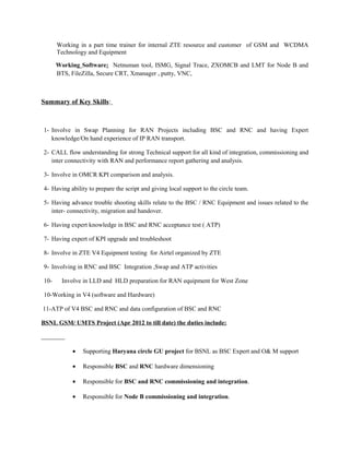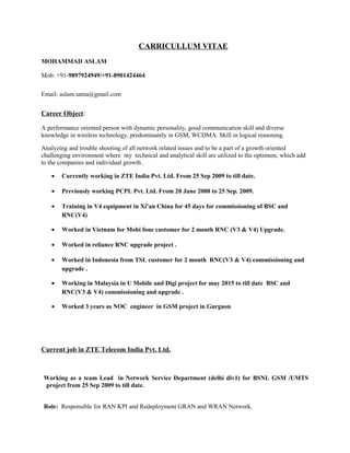 Mohammad Aslam is a network engineer with over 10 years of experience working with GSM and WCDMA technologies. He currently works as a team lead for BSNL projects in ZTE India, where he is responsible for network performance monitoring and equipment redeployment. His experience includes equipment installation, commissioning, integration testing, and troubleshooting in various countries. He has expertise in ZTE BSC, RNC, and NodeB equipment configurations and software upgrades.