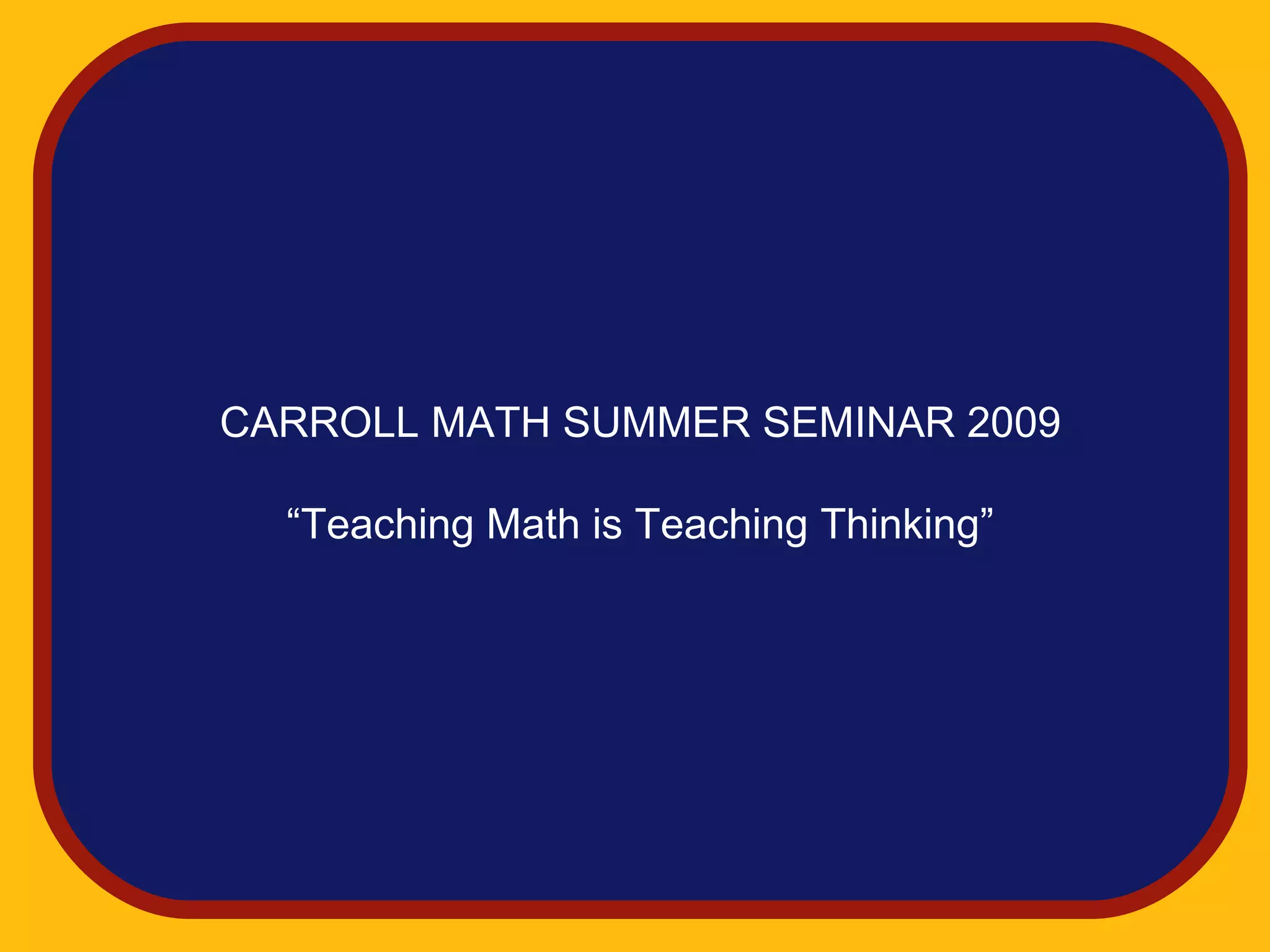 This document introduces the Carroll Math Summer Seminar 2009. [1] It provides a brief history of Carroll school, which opened in 1967 to teach dyslexic children and moved to its current campus in 1972. [2] It explains that Carroll struggled to find an effective math curriculum for its students and developed its own called Carroll Math, which combines various commercially available math programs and copyrighted materials. [3] The theme of the week-long seminar is to show how Carroll students with language difficulties can solve math problems conceptually through thinking rather than relying on traditional skills.