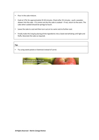1. The document provides instructions for making a carrot cake, including a list of ingredients and steps. It describes adding oil, sugar, eggs, flour, popcorn, and other ingredients to a mixing bowl and whisking them together. The instructions also include folding the mixture into an orange-colored batter and baking the cake in an oven for 30 minutes.