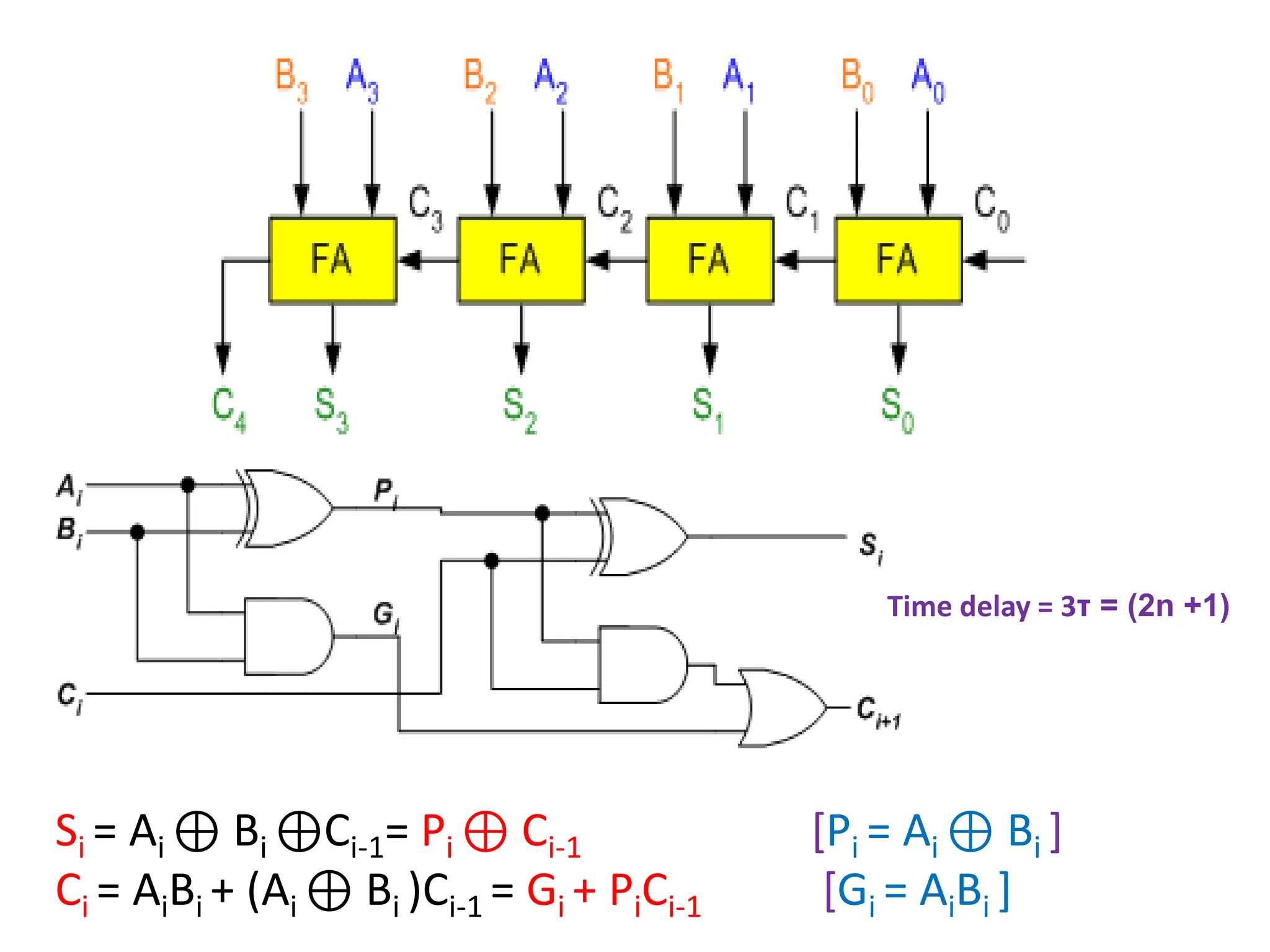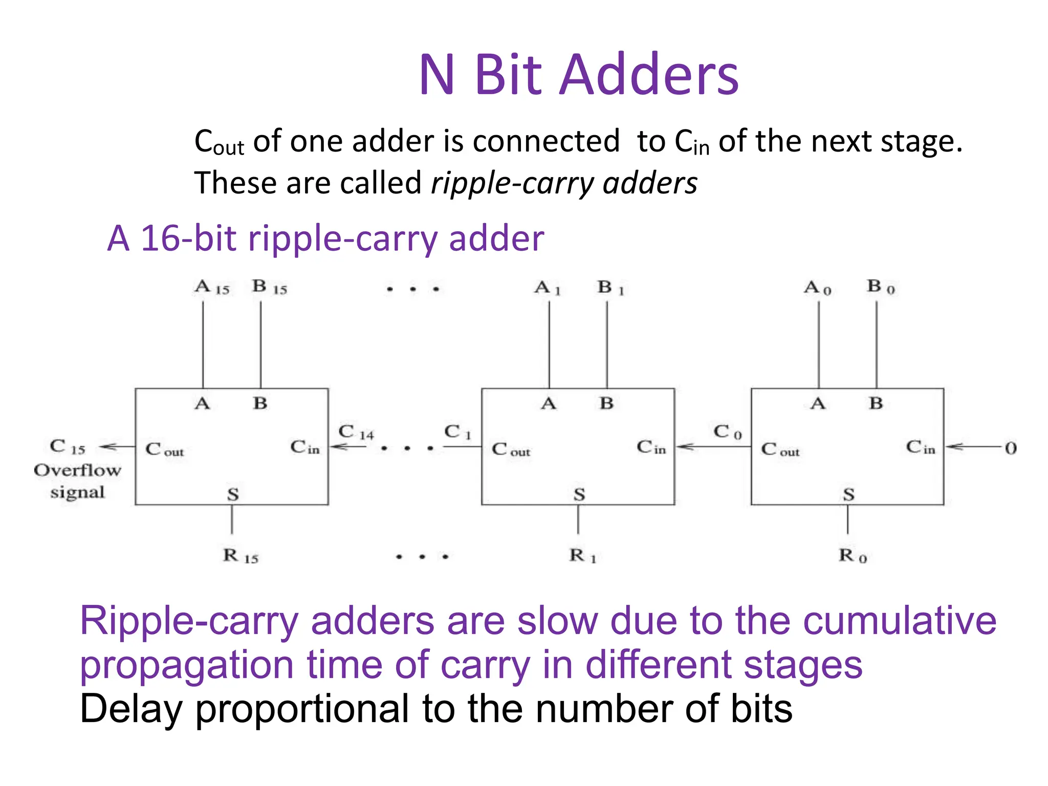 The document discusses the concepts of ripple-carry adders and carry look-ahead adders, explaining their mechanisms and delays in processing binary addition. It introduces the arithmetic logic unit (ALU), detailing its function in performing arithmetic and logical operations, as well as components like encoders and decoders used in digital circuits. Additionally, it describes the complexities associated with implementing CLA adders for larger bit sizes and presents examples of digital circuits including octal-to-binary encoders and BCD-to-decimal decoders.