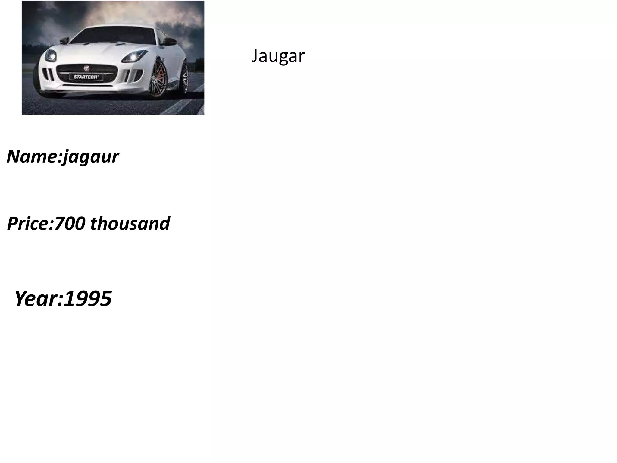 The document lists details for 3 vehicles including their names, prices, and years. A jaguar from 1995 is listed at 700 thousand, a BMW from 1965 at 2 million, and a Lamborghini Avendator at 6 million.