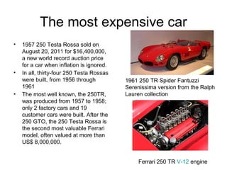 The document discusses several notable cars including the most expensive (1957 Ferrari 250 Testa Rossa), smallest (Zagato Volpe), flying car (Terrafugia Transition), lightest (Roadrazer at 661 pounds), and fastest (Bugatti Veyron at 267.856 mph). Key details provided on each include price, dimensions, engine specifications, and world records held. Sources for the information are listed as various Wikipedia articles and automotive websites.