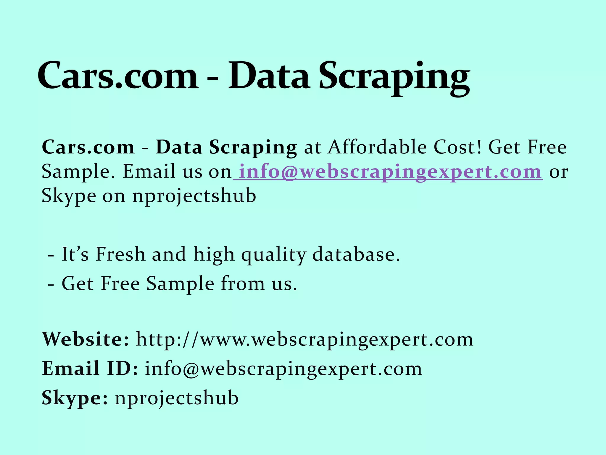 This document advertises data scraping services for automotive databases including new cars, used cars, and car dealers. It offers to provide samples of data that can be scraped including names, specifications, pricing, photos and more. Interested parties are instructed to email reach2ry@gmail.com for a free sample and more information. The document lists various data scraping and research services.