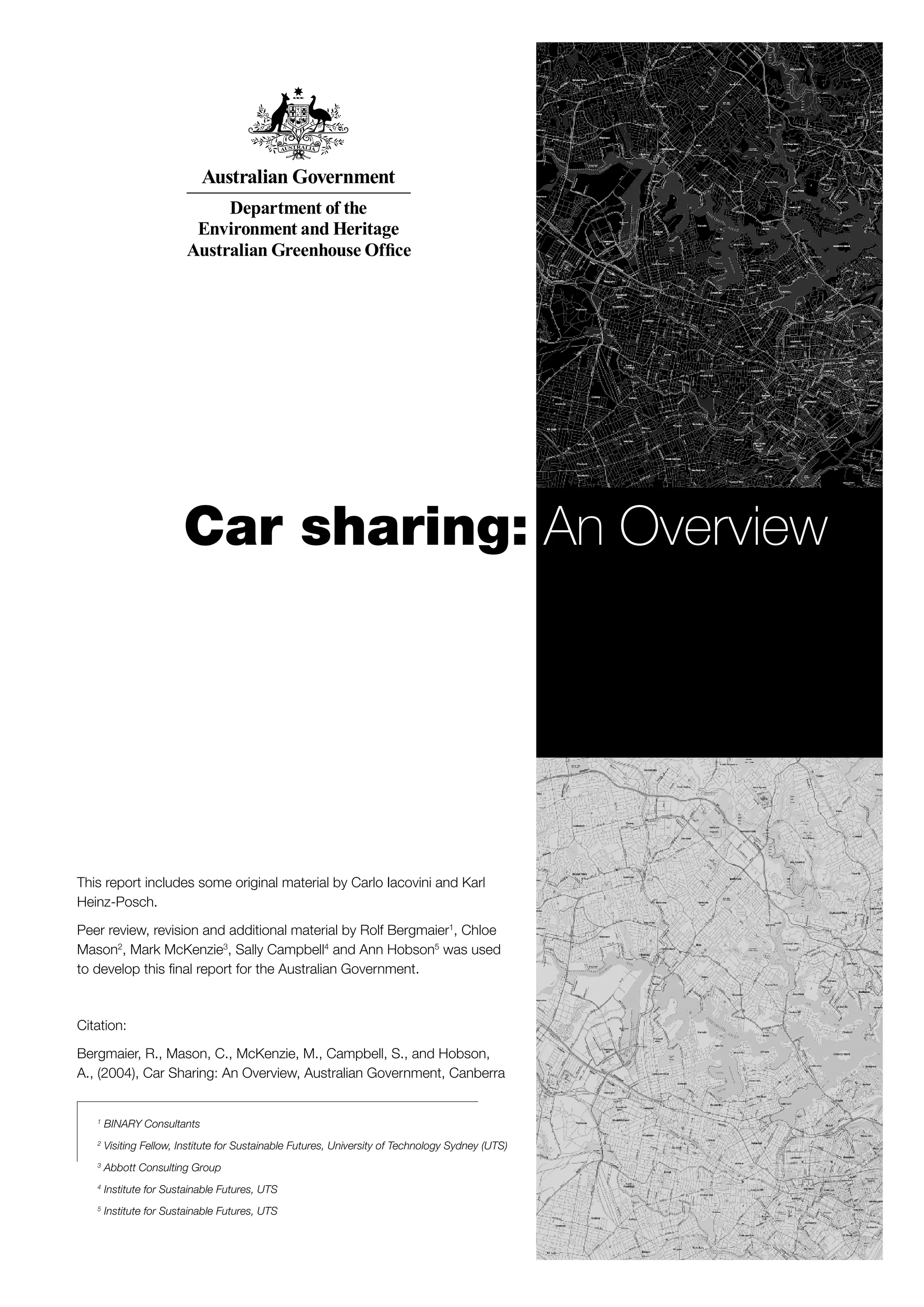This report provides an overview of car sharing, discussing its concept, history, and examples of successful implementation in various countries, particularly highlighting the benefits to individuals, communities, and the environment. It notes Australia's growing car dependency and greenhouse gas emissions, while outlining the essential relationships and criteria for establishing successful car sharing organizations (CSOs). The report emphasizes the need for CSOs to effectively manage relationships with local governments, vehicle manufacturers, and public transport to meet the mobility needs of urban populations.