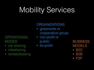 The document discusses various models and trends in car sharing, including traditional car sharing, peer-to-peer car rentals, and ridesharing, emphasizing their role as alternatives to car ownership and their environmental benefits. It outlines user motivations, demographics, and characteristics of different types of car sharing organizations, as well as the challenges faced by these organizations. The text also details usage patterns, pricing mechanisms, and the integration of technology in facilitating these services.