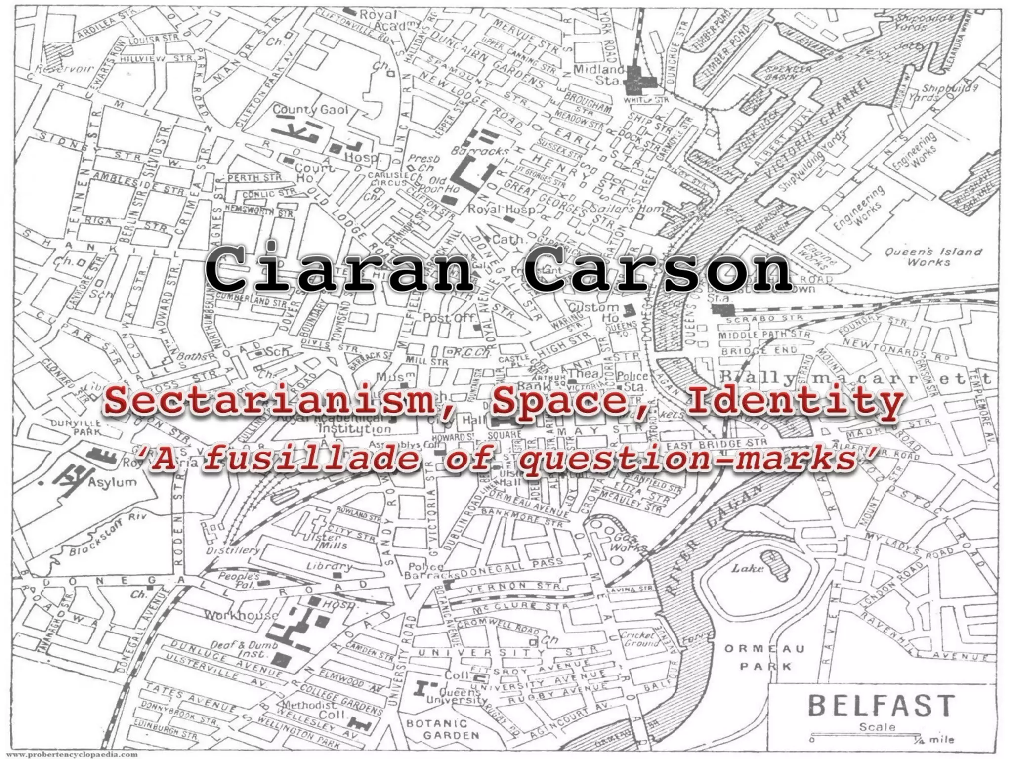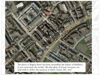 The poem "Belfast Confetti" by Ciaran Carson describes a riot in Belfast through linguistic and typographical imagery. As the riot squad moves in, various objects rain down like punctuation marks. The streets of the city become blocked by stops, colons, and other typographical symbols, disorienting the speaker and making escape impossible. By textualizing the city through this unconventional use of language and typography, Carson represents Belfast as both a physical space undergoing violence and a textual space under the control of the poet through manipulation of words on the page.
