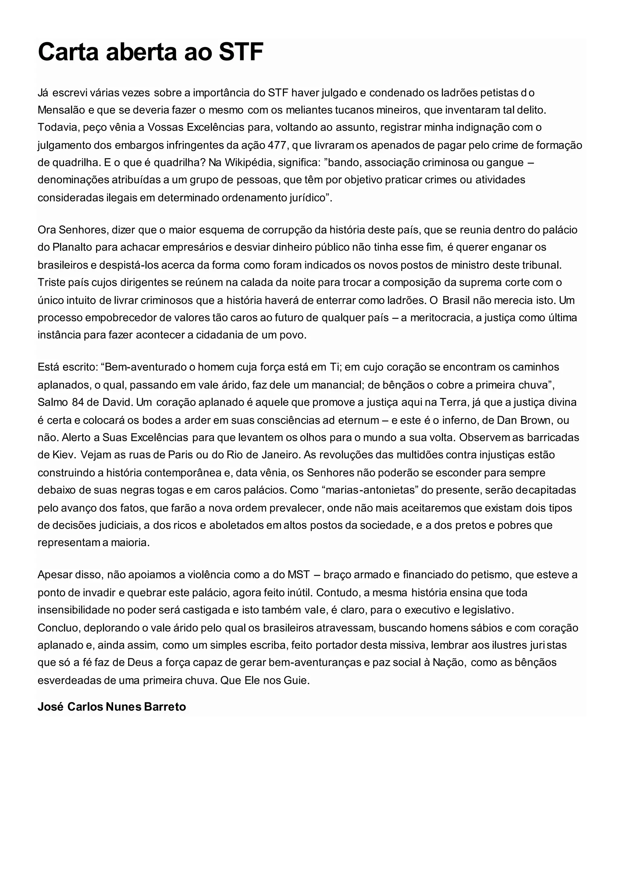 A carta critica a decisão do STF de livrar os condenados do Mensalão da acusação de formação de quadrilha. O autor argumenta que o esquema de corrupção do Mensalão se encaixava na definição de quadrilha e que a decisão do STF pareceu ter o objetivo de proteger criminosos. Ele também alerta que as massas não aceitarão mais duas justiças diferentes para ricos e pobres e que a história punirá a insensibilidade no poder.