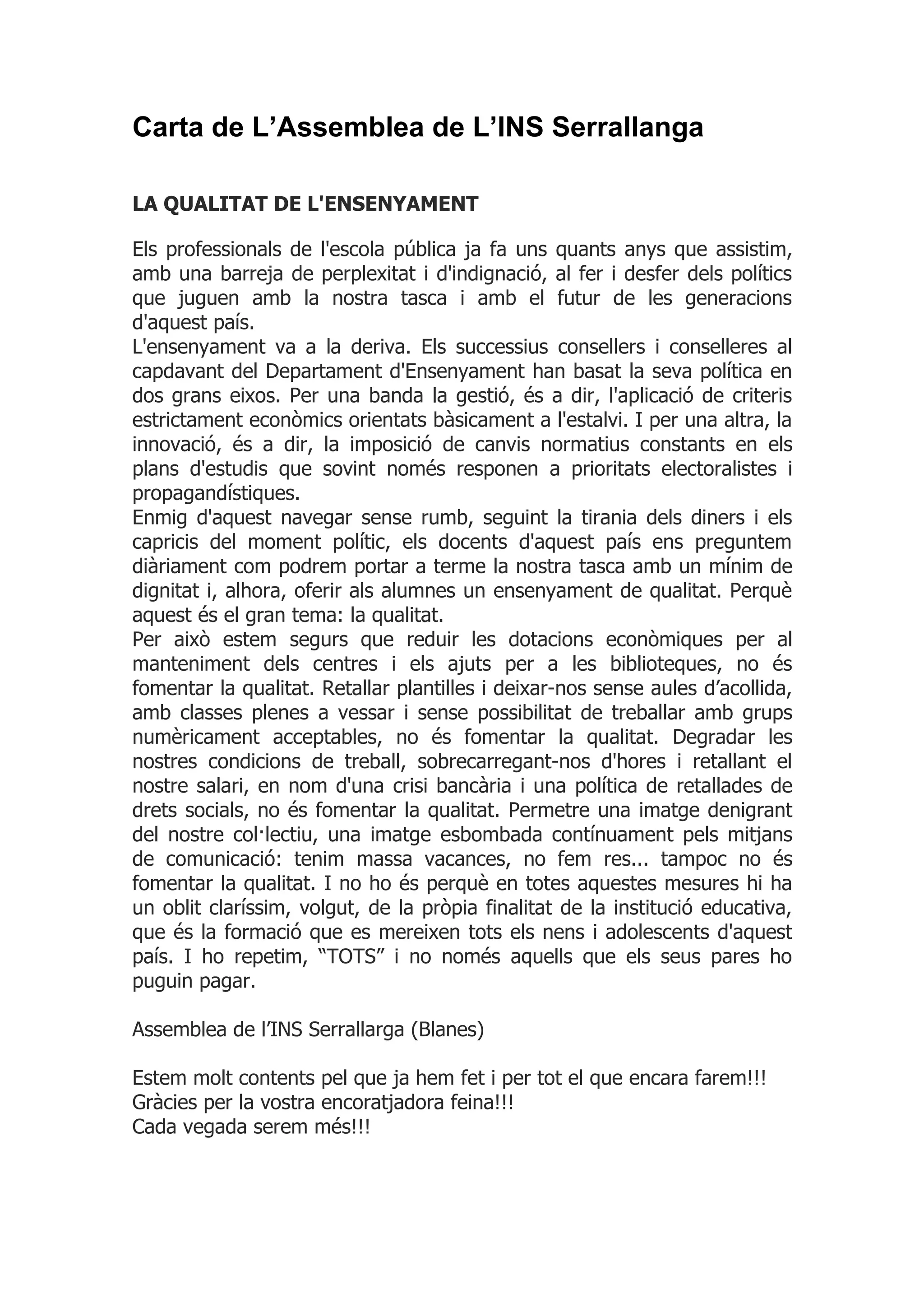 Carta de L’Assembleade L’INS Serrallanga