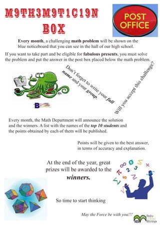 Each month, a math problem will be posted on the high school noticeboard. Students can take part by solving the problem and submitting their answer in the post box below. The Math Department will announce the solution and top 10 scoring students monthly. Points will be given based on accurate answers and explanations. At the end of the year, great prizes will be awarded to the overall winners.