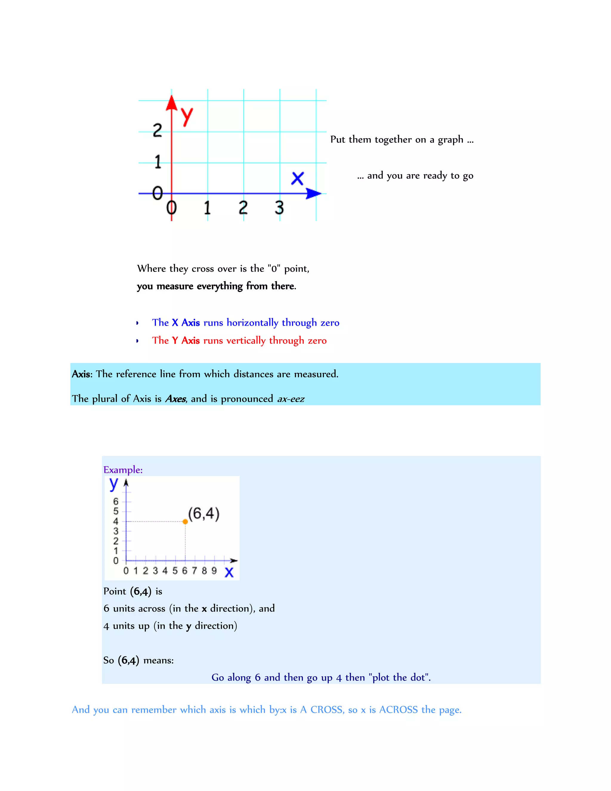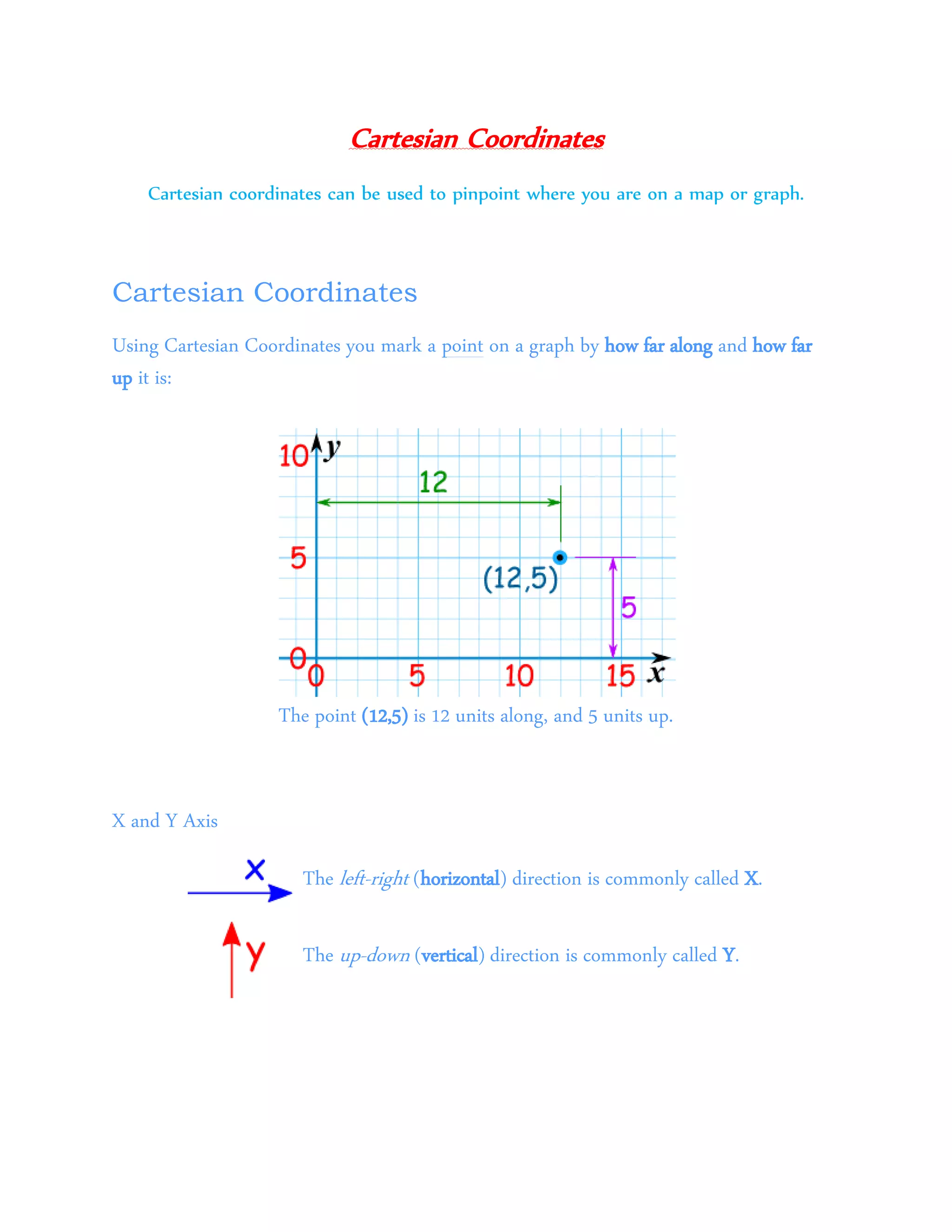 Cartesian coordinates use a grid system to precisely locate points in space. A point is identified by its x and y coordinates, which indicate the distance from the origin point along the x-axis and y-axis. For example, the point (3,2) is located 3 units to the right of the origin along the x-axis and 2 units above the origin along the y-axis. The axes divide the plane into four quadrants, with points falling into different quadrants based on whether their x and y values are positive or negative. Cartesian coordinates provide a way to pinpoint locations using simple numbers.