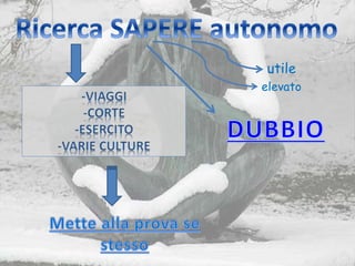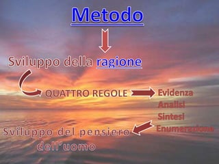 Il documento discute il pensiero di Cartesio riguardo alla conoscenza, considerandola un processo continuo e graduale che contribuisce allo sviluppo del pensiero umano. Si enfatizza l'idea di Dio come una sostanza perfetta e immutabile, creatrice di tutto ciò che esiste, e si fa riferimento alla capacità umana di conoscere attraverso la retorica, la grammatica, la logica, la metafisica, la fisica e la matematica.