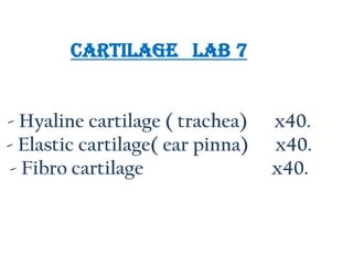 This document summarizes slides from cartilage and bone labs examining different types of cartilage and bone under the microscope. It describes the key characteristics of hyaline cartilage, elastic cartilage, and fibrocartilage, including their matrix composition and distribution of chondrocytes. For bone, it outlines the microscopic features of compact bone, cancellous bone, intramembranous ossification, and endochondral ossification, focusing on the presence of Haversian systems, bone trabeculae, ossification centers, and the epiphyseal plate zones.