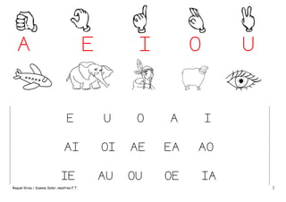 This document appears to be an educational resource that presents Spanish words beginning with various letters of the alphabet. Each page features words starting with a different letter or combination of letters. The resource was created by Raquel Girau i Susana Soler, who are identified as P.T. teachers, likely meaning physical education teachers. The document exposes young learners to many common Spanish words through a visually engaging format with illustrations.