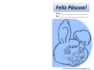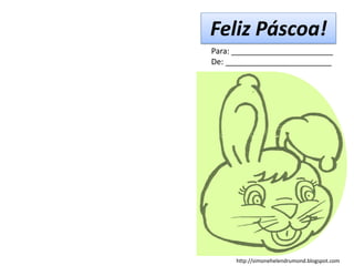 The document is an Easter greeting card template with fields for the recipient and sender left blank. It contains the text "Feliz Páscoa!" which means "Happy Easter!" and provides a URL for a blog.