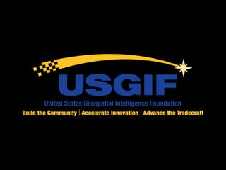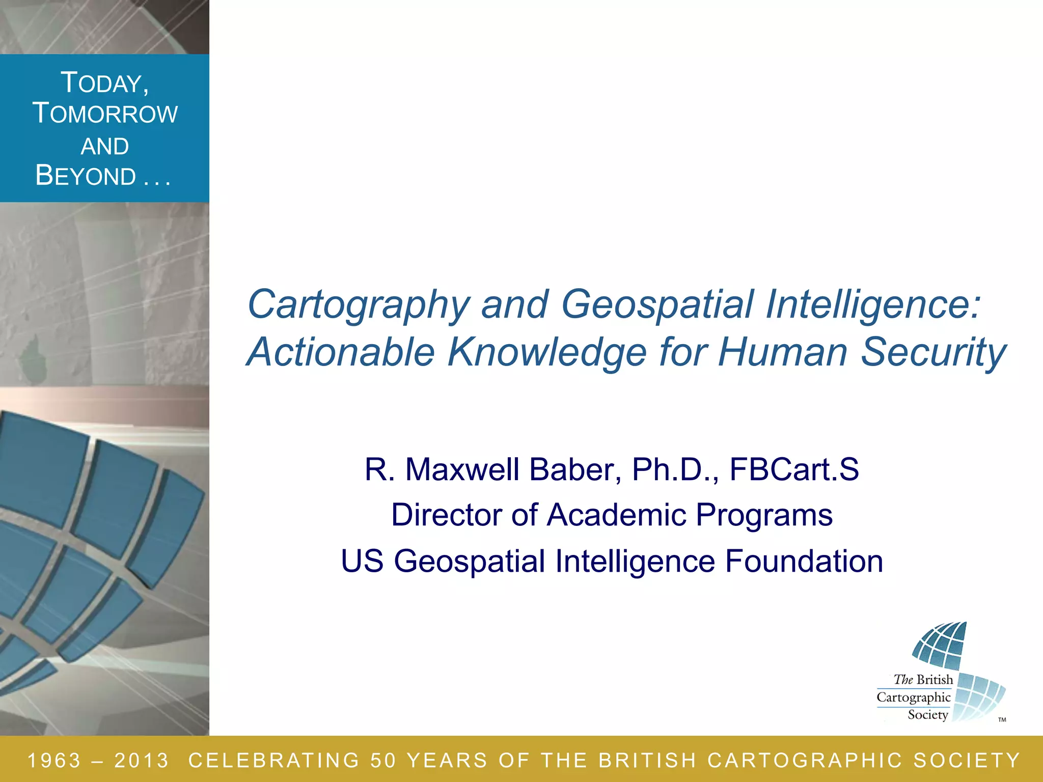 The document celebrates 50 years of the British Cartographic Society, emphasizing the evolution and significance of geospatial intelligence (GEOINT) as actionable knowledge vital for human security. It outlines GEOINT's processes and applications, including the collection and analysis of spatial data, and highlights its interdisciplinary nature involving various fields such as human geography and cartography. Additionally, it discusses R&D priorities and the importance of critical thinking and spatial reasoning in the GEOINT profession.