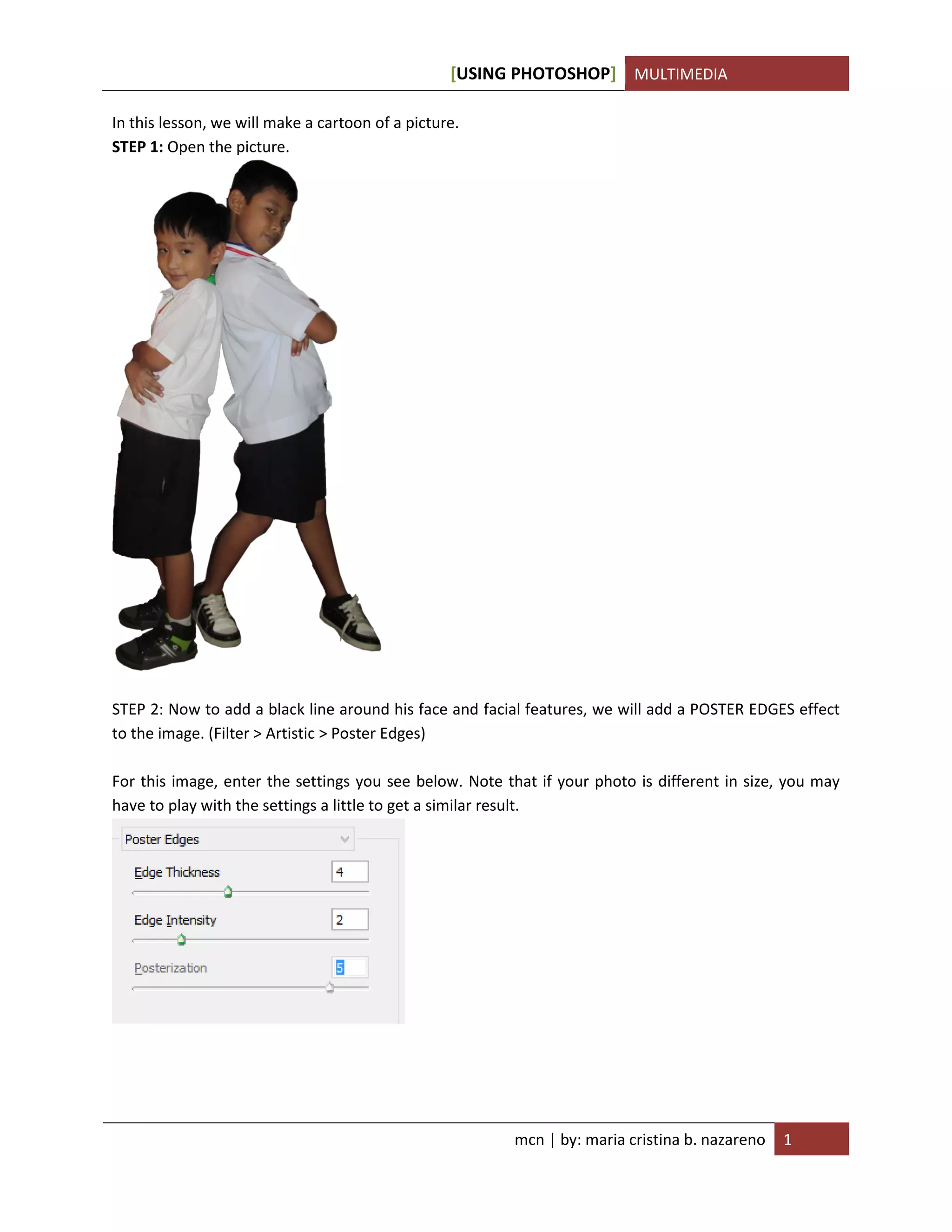 This document provides a step-by-step guide on how to create a cartoon effect from a photograph using Photoshop. It covers various techniques such as applying filters, adjusting settings, and using layers for painting and shading. The instructions include adding effects like torn edges, smoothing lines, applying color, and creating a background, culminating in a polished cartoon image.