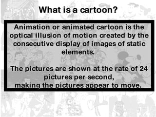 Cartoons can be created through both traditional animation and computer animation techniques. Traditional animation involves hand drawing each frame while computer animation uses 3D computer graphics. Some of the earliest animated cartoons date back to the late 1800s and early 1900s. Popular animation studios that produce cartoons include Disney, Warner Bros., Hanna-Barbera, and many others. Different styles of cartoons also emerged such as anime which originated in Japan with manga-influenced stories.