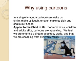 The document discusses using cartoons to teach language in the classroom. Cartoons can engage students' attention because they are colorful, amusing, and appeal to our inner child. They can be used to stimulate students to read literary classics. However, cartoons also have limitations because the mouth movements that help with speech comprehension are missing. The document provides some activities for using cartoons effectively in the classroom, such as reading transcripts, cloze exercises, and student mini-plays.