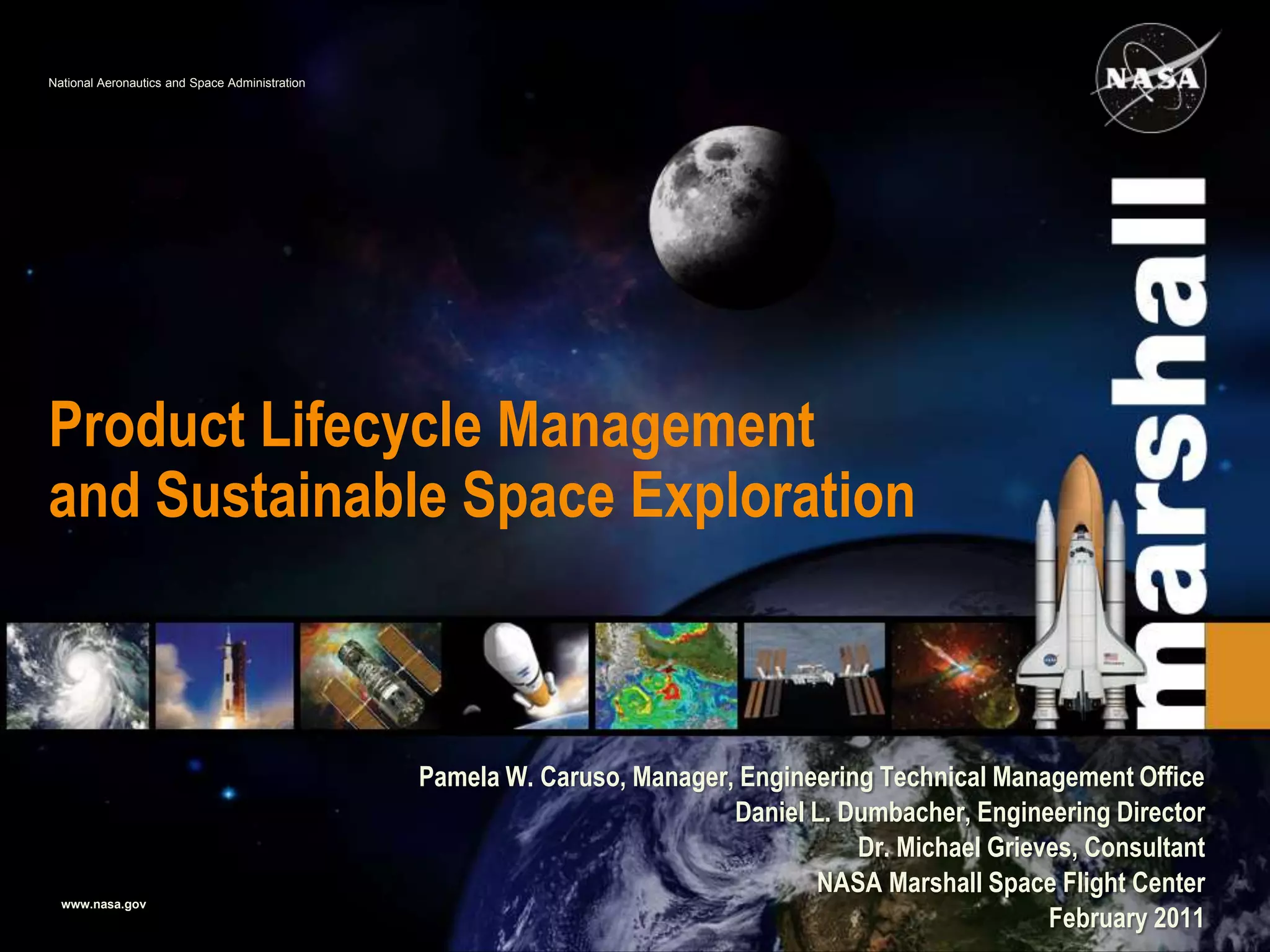 This document discusses product lifecycle management (PLM) and its application at NASA. PLM is used widely in industry to improve product quality and reduce costs by managing information across the entire product lifecycle. At NASA, PLM and systems engineering are important for sustainable space exploration as 85% of project costs are locked in during system design. NASA processes support implementing PLM to better manage information from concept to operations and disposal.
