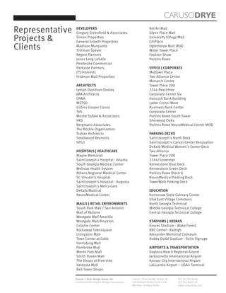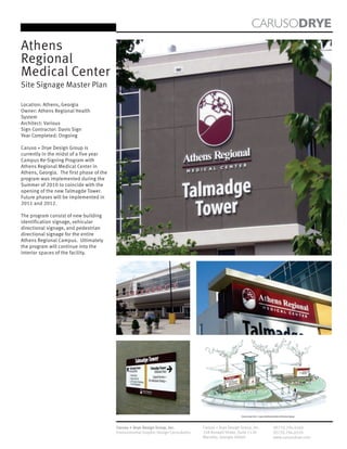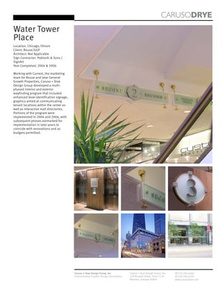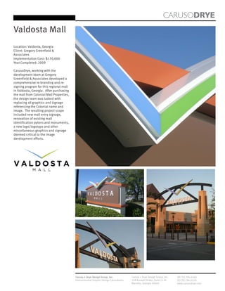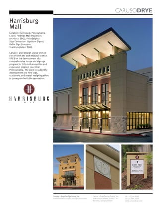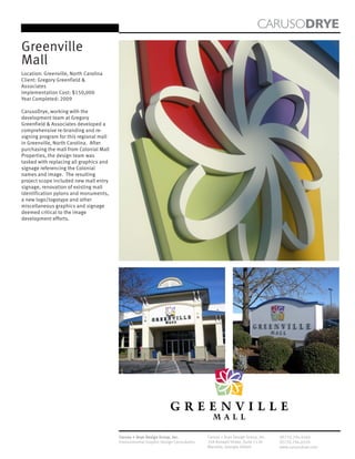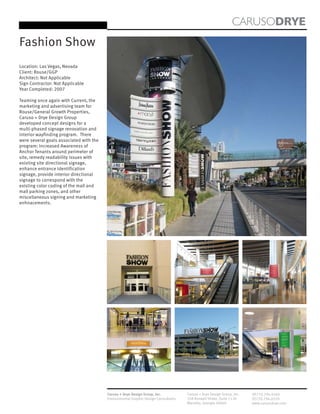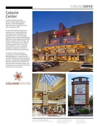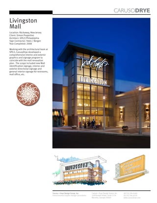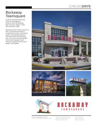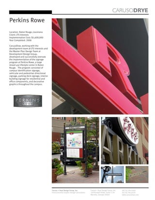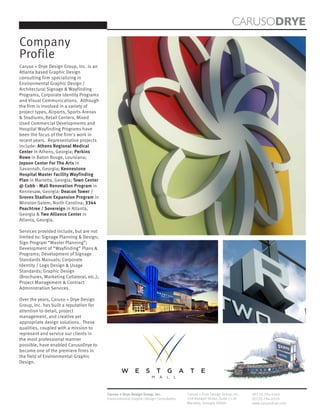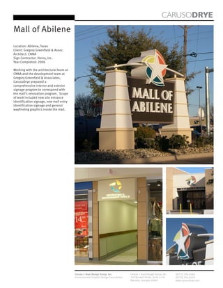 The document provides details on several signage projects completed by CarusoDrye Design Group between 1993-2011. It includes information on retail center, mall, airport, university campus, stadium, and office building projects. For each project, it lists the location, client, architect, sign contractor, year completed, and sometimes a brief description of the scope of work which generally involved developing interior and exterior signage programs.