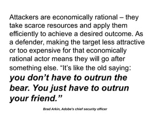 The document discusses IT security challenges faced by libraries, emphasizing that libraries often lack the resources for robust security measures. It highlights the importance of a defensible mindset, understanding vulnerabilities, and adopting effective threat modeling strategies. The document also stresses the need for ongoing training and awareness programs to foster a culture of security among staff and patrons.