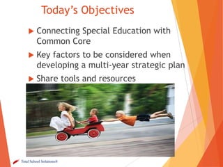 This document provides an overview of a presentation on implementing Common Core State Standards for special education students. The objectives covered include connecting special education to Common Core, factors to consider in developing a strategic plan, and sharing tools and resources. The presentation addresses key topics such as writing IEP goals using grade-level Common Core standards, providing access to the general education curriculum, and differentiating instruction for special education students. It emphasizes building on the general education implementation plan and involving special education staff in professional development. Group activities have attendees discuss changes to service delivery models and support needed by related service providers to help special needs students meet Common Core standards.