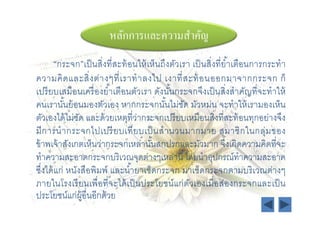 “กระจก”เป็ นสิงทีสะท้ อนให้ เห็นถึงตัวเรา เป็ นสิงทียําเตือนการกระทํา ความคิ ด และสิ งต่ า งๆที เราทํ า ลงไป เงาที สะท้ อนออกมาจากกระจก ก็ เปรี ยบเสมือนเครื องยําเตือนตัวเรา ดังนันกระจกจึงเป็ นสิงสําคัญทีจะทําให้ คนเรานันย้ อนมองตัวเอง หากกระจกนันไม่ชด มัวหม่น จะทําให้ เรามองเห็น ั ตัวเองได้ ไม่ชด และด้ วยเหตุทีว่ากระจกเปรี ยบเหมือนสิงทีสะท้ อนทุกอย่างจึง ั มี ก ารนํ า กระจกไปเปรี ย บเที ย บเป็ นสํ า นวนมากมาย สมาชิ ก ในกลุ่ม ของ ข้ าพเจ้ าสังเกตเห็นว่ากระจกเหล่านันสกปรกและมัวมาก จึงเกิดความคิดทีจะ ทําความสะอาดกระจกบริ เวณจุดต่างๆเหล่านี โดยนําอุปกรณ์ทําความสะอาด ซึงได้ แก่ หนังสือพิมพ์ และนํายาเช็ดกระจก มาเช็ดกระจกตามบริ เวณต่างๆ ภายในโรงเรี ยนเพือที จะได้ เป็ นประโยชน์ แก่ตวเองเมือส่องกระจกและเป็ น ั ประโยชน์แก่ผ้ อืนอีกด้ วย ู