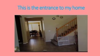 This document provides a tour of a home, describing the entrance, living room where guests are welcomed, the kitchen which is the author's favorite room, and the dining room where the whole family eats dinner together. Additional rooms mentioned include the bathroom and the author's bedroom, which they like to keep clean and organized.