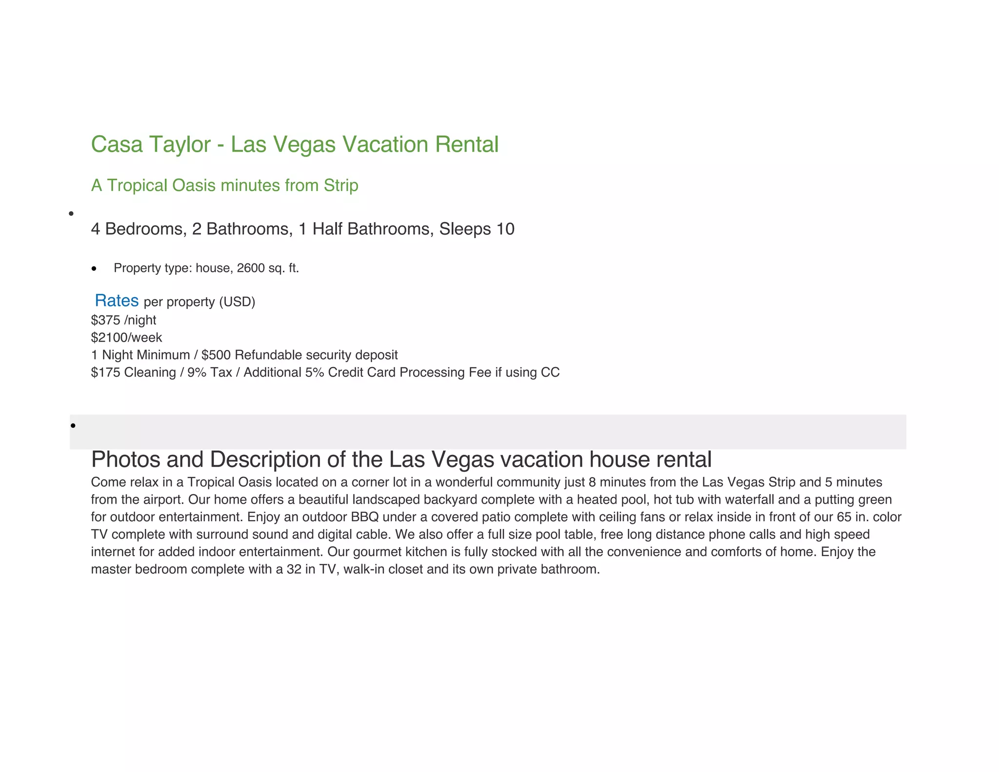 This listing describes a 4 bedroom, 2.5 bathroom vacation house rental located 8 minutes from the Las Vegas Strip. The 2600 square foot home includes amenities like a heated pool, hot tub, putting green, and pool table. Nightly rates are $375 with weekly rates of $2100. The home sleeps up to 10 guests and is described as a "Tropical Oasis" with landscaped backyard and outdoor entertainment areas.