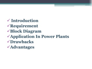 This document discusses cascade control systems. It defines cascade control as using two closed loop controllers where the output of the first controller is the set point of the second. The first loop is called the master controller and the second the slave controller. Cascade control provides more precise control of processes with multiple stages. It allows compensation for load changes and helps maintain desired values. The document outlines applications in steam power plants including drum level control and steam temperature control. It notes both advantages like improved dynamics but also drawbacks like increased complexity and cost.