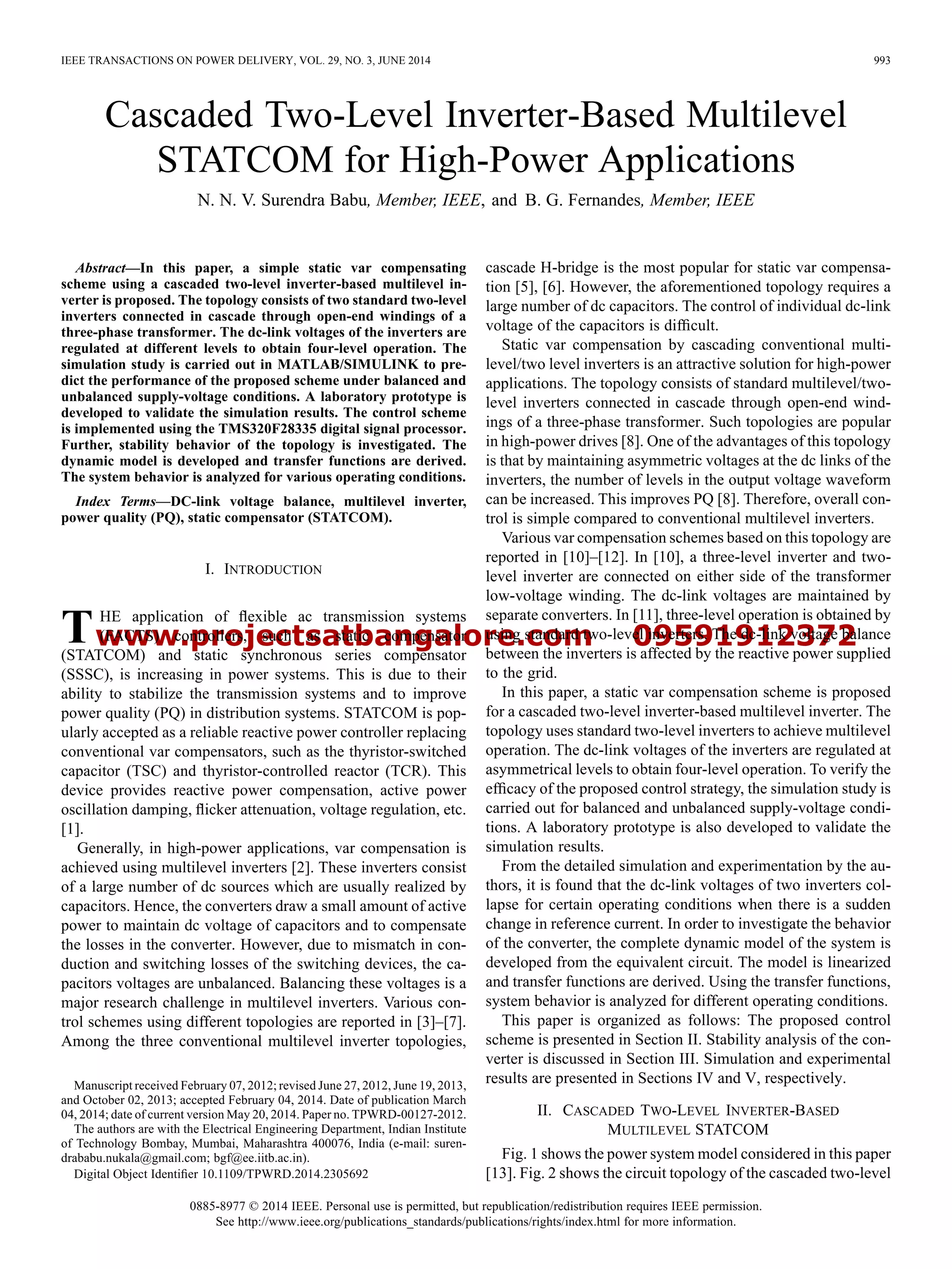 This document proposes a cascaded two-level inverter topology for static var compensation (STATCOM) applications. It consists of two standard two-level inverters connected through the open-windings of a transformer. By regulating the DC voltages of the inverters at different levels, a four-level output voltage is achieved. Simulation and experimental results validate the control strategy under balanced and unbalanced grid conditions. However, instability was observed when the reference current changed suddenly. Therefore, a dynamic model is developed and transfer functions are derived to analyze the system behavior under different operating conditions.