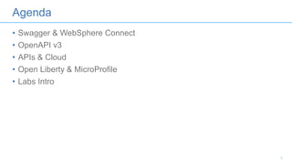 This document provides an agenda and overview for a WebSphere Proof of Technology presentation on OpenAPI and APIs in WebSphere Liberty and the cloud. The presentation covers Swagger & WebSphere Connect, OpenAPI v3, APIs & Cloud, Open Liberty & MicroProfile, and introduces some labs. It discusses Swagger/OpenAPI specifications and tooling, API documentation and discovery in WebSphere Liberty, pushing APIs to IBM Cloud and containers, and collaborating on OpenAPI and MicroProfile standards.