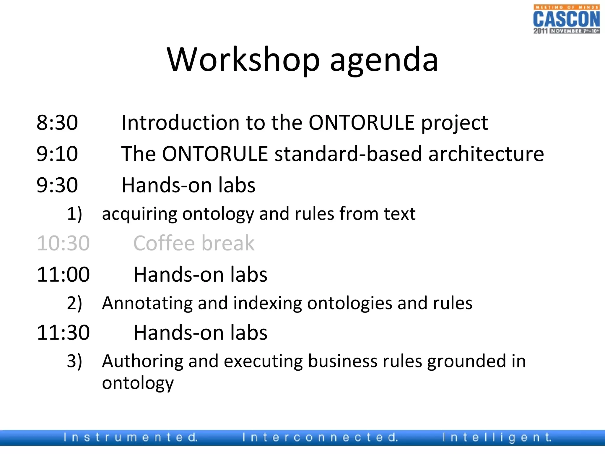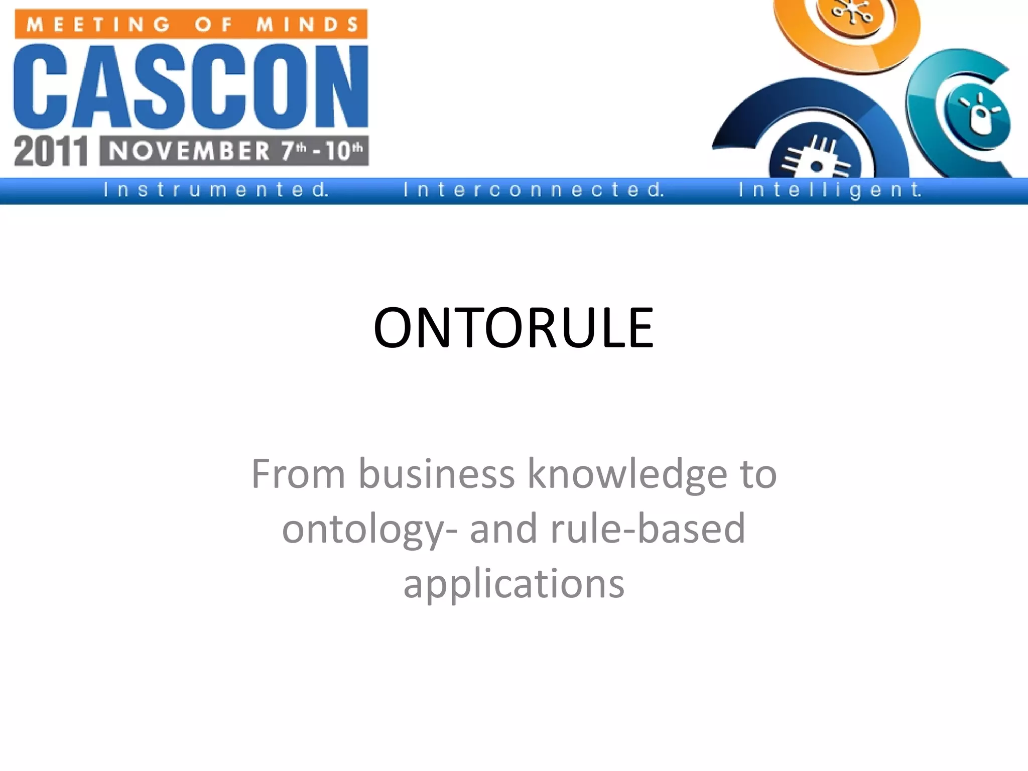 The document discusses the ONTORULE project, which aims to reconcile how business users write rules and policies using natural language with how rule engines require formal semantics and data models. It proposes formalizing vocabularies as ontologies to ground natural language policies and rules, separating domain knowledge from business rules and implementation details. This would allow rules and policies to be consistently applied across applications and organizations. The project seeks to develop standard-based tools to acquire, author, and execute rules grounded in ontology.