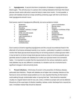 1. The document provides medical advice for people with diabetes during emergency situations such as hurricanes. It stresses identifying yourself as having diabetes to receive proper care, avoiding dehydration by drinking enough fluids, and being prepared to treat hypoglycemia.