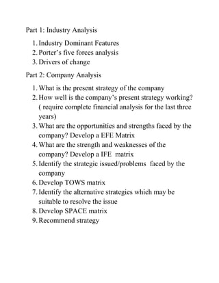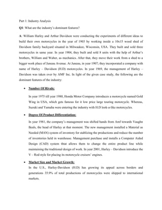 This document provides an analysis of Harley-Davidson's motorcycle industry and the company's strategy. Part 1 analyzes the industry, discussing its dominant features, Porter's five forces, and drivers of change. Part 2 analyzes Harley-Davidson's strategy, including its present focused differentiation strategy, positive recent financial performance, opportunities in international markets and among new demographics, and strengths identified in an EFE matrix. The document conducts a thorough analysis to evaluate Harley-Davidson's industry and strategy.