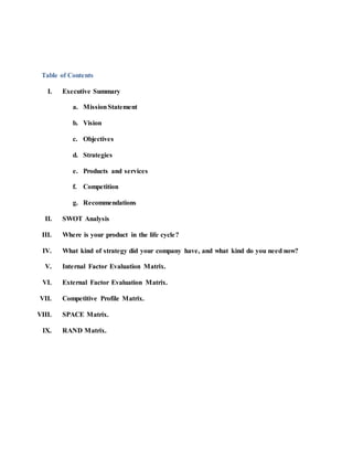 This document provides an executive summary and analysis of Keurig, a company that produces single-serve coffee brewing systems and K-Cup packs. It discusses Keurig's mission, vision, objectives, strategies, products/services, competition, and recommendations. The summary analyzes Keurig's strengths such as its strong brand recognition, patented brewing technology, and wide distribution channels. It also examines factors in Keurig's external business environment and provides suggestions to help lower costs and expand markets.