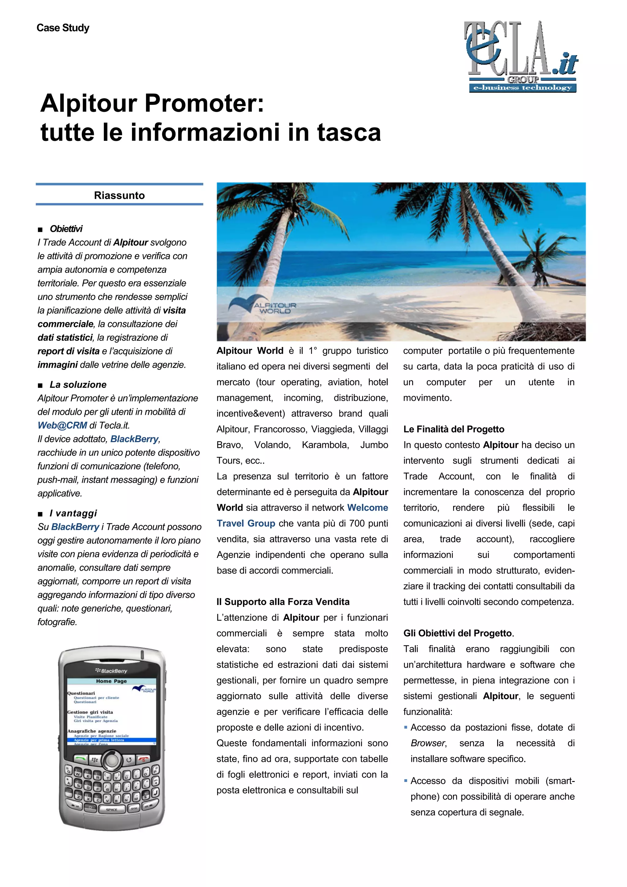 Il case study descrive l'implementazione di Alpitour Promoter, un sistema progettato per rendere più efficienti le attività di promozione e verifica dei trade account di Alpitour tramite dispositivi mobili BlackBerry. Le funzionalità includono raccolta di report di visita, accesso a dati statistici e gestione di comunicazioni, migliorando l'autonomia e la flessibilità degli utenti sul territorio. Il progetto ha permesso una integrazione con i sistemi gestionali di Alpitour e ha ottimizzato il processo di vendita e comunicazione tra sede e agenzie.