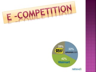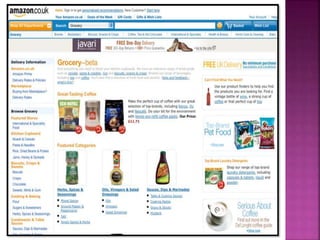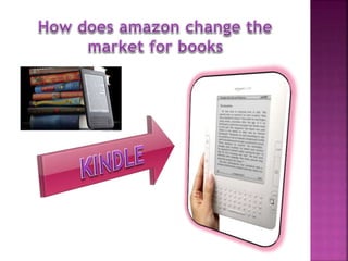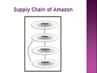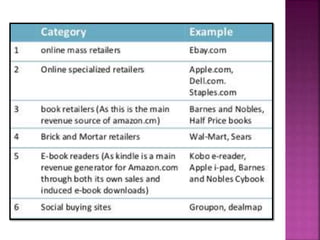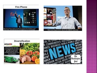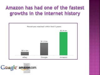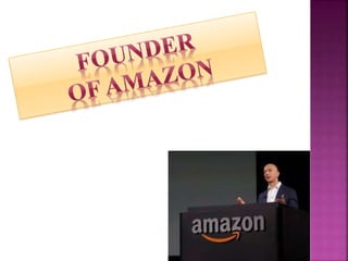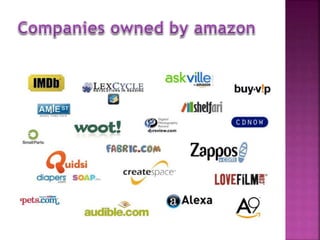 The document discusses Amazon, founded by Jeff Bezos in 1994. It started as an online bookstore but expanded to sell various products online and develop Kindle e-readers and Fire tablets. Amazon has separate retail websites for different countries and regions. The document outlines Amazon's history, vision, marketing strategies, competition, and diversification into other product categories and services.