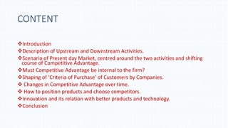 This presentation discusses the strategic shift from upstream to downstream activities in marketing, emphasizing that customer needs and purchase criteria now drive business success. Downstream activities, such as shaping customer perception and innovation, have become crucial for establishing competitive advantage over time. The document illustrates these concepts with examples and highlights the importance of understanding and responding to evolving customer preferences in modern market dynamics.
