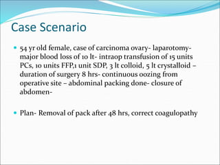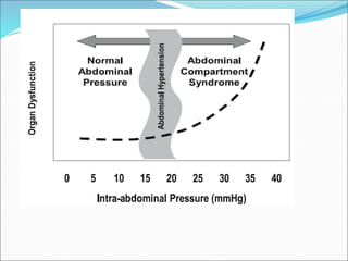A 54-year old female underwent a major surgery for carcinoma ovary with significant blood loss requiring multiple transfusions. Post-operatively she developed signs of intra-abdominal hypertension including decreased urine output, elevated CVP and hypotension. Her intra-abdominal pressure was measured to be over 20 mmHg consistent with abdominal compartment syndrome, a condition where elevated intra-abdominal pressure compromises organ function. She required surgical decompression to relieve the pressure and allow organ recovery.
