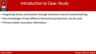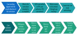 This document discusses case studies as a teaching method. It defines a case study as research-based documentation that presents real-world problems without clear solutions. Case studies encourage critical thinking by placing students in complex situations and requiring them to analyze multiple perspectives. They develop skills like problem-solving, decision-making, and collaboration. The document also outlines the structure of a typical case study, including sections for background information, the main problem, and open-ended discussion questions.