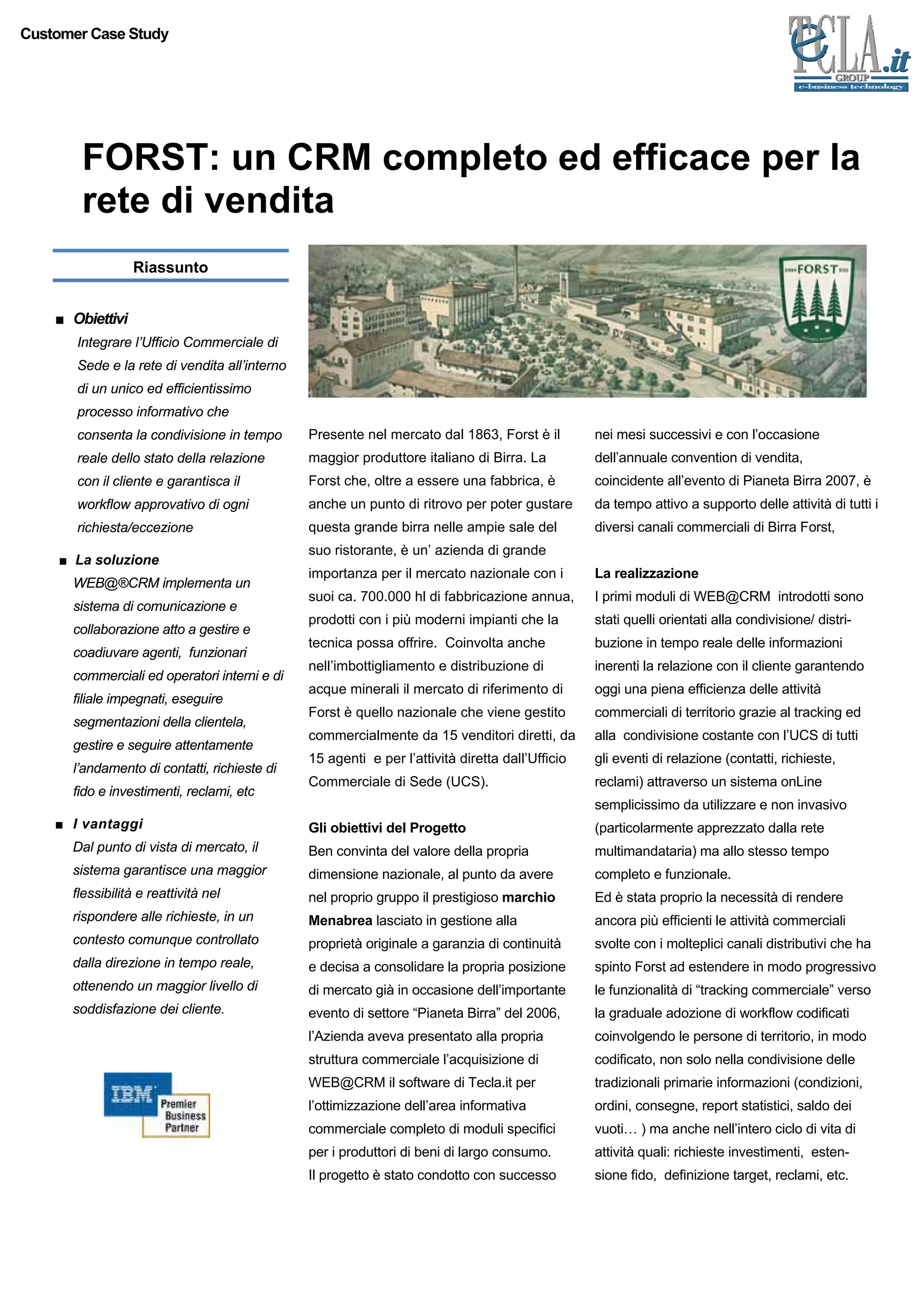 Il caso studio di Forst illustra l'implementazione di un CRM completo, web@CRM, per ottimizzare la comunicazione tra l'ufficio commerciale e la rete di vendita, migliorando così l'efficienza operativa e la soddisfazione del cliente. L'azienda, leader nel mercato birrifico italiano, ha adottato innovative soluzioni di gestione delle informazioni commerciali per garantire risposte rapide e flessibili alle esigenze di mercato. I risultati ottenuti includono una significativa ottimizzazione dei flussi informativi e una maggiore reattività alle richieste della clientela.