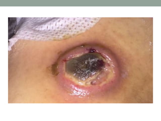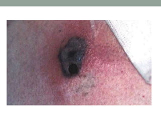 This document discusses the case of a 21-year-old female patient with a history of acute lymphoblastic leukemia (ALL) and acute myeloid leukemia (AML) who developed a skin lesion on her arm during chemotherapy treatment for AML relapse. Skin biopsy revealed infection with Aspergillus fumigatus. She was diagnosed with cutaneous aspergillosis and treated intravenously with voriconazole. Cutaneous aspergillosis is a rare manifestation of disseminated infection most commonly caused by A. fumigatus in immunocompromised patients, with skin lesions occurring in 5-10% of cases. Treatment involves intravenous antifungal drugs such as amphotericin B