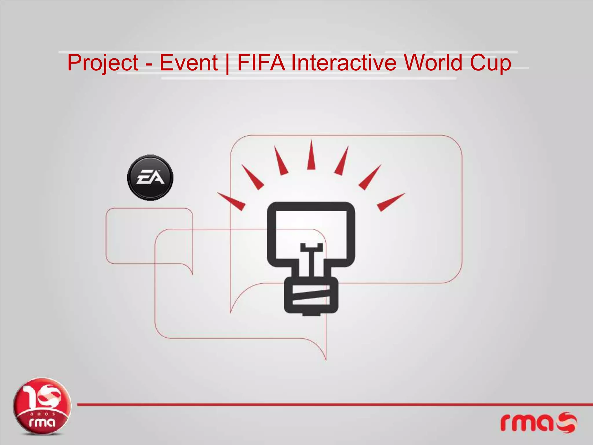 The document discusses EA's plans for the FIFA Interactive World Cup event. It notes that EA is the largest developer of interactive entertainment software, with 27 titles and 8,000 employees. The event aims to impact soccer fans, not just gamers, guarantee broad press coverage, bring the public to the event, and adjust communications to FIFA's rules. Public relations efforts will target gamers, journalists, and athletes. Previous events saw over 25 million people impacted, over 100 articles published, coverage on 5 TV stations including live broadcasts, and over 300 players enrolled, all within 30 days.