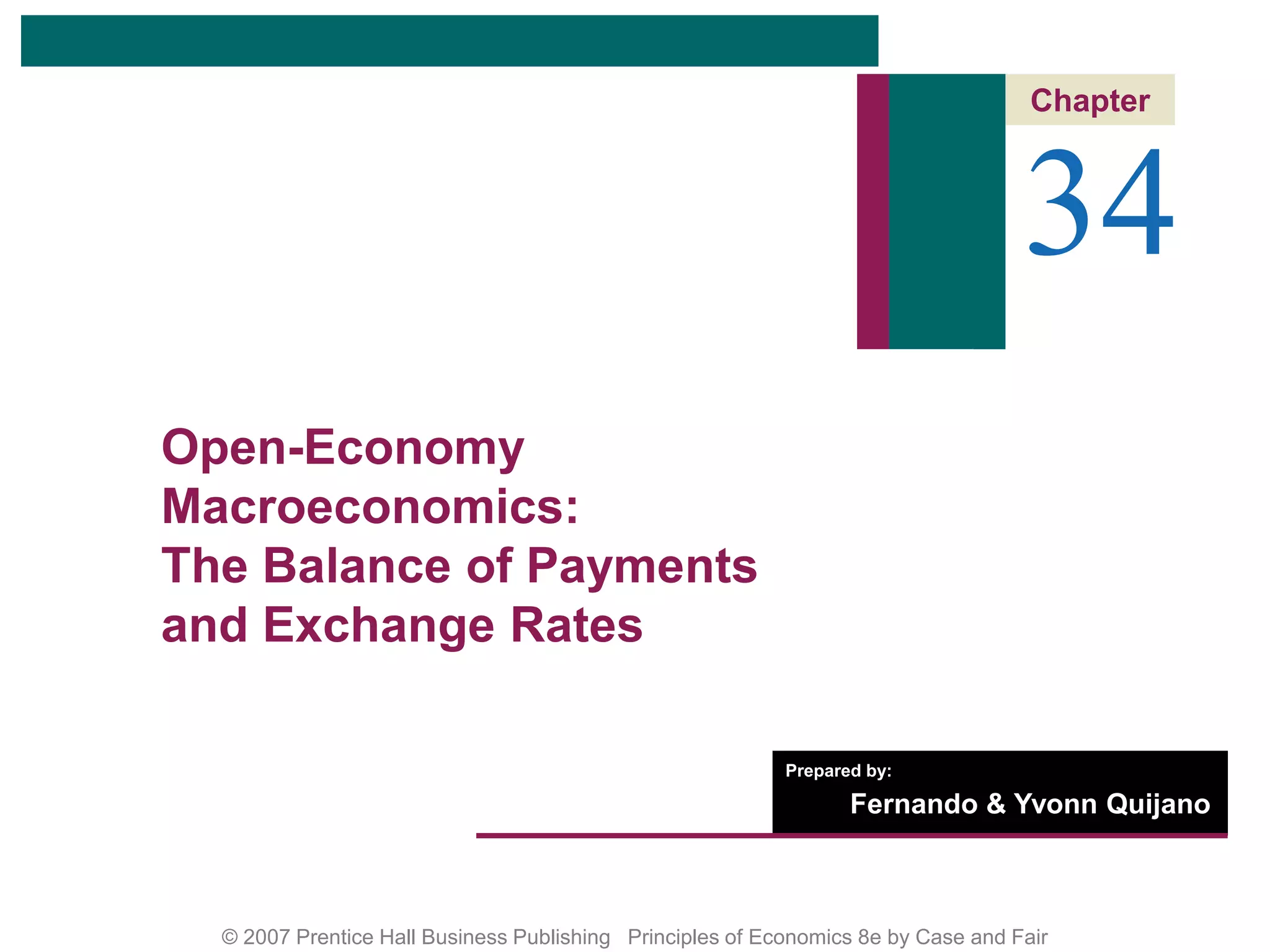 This chapter discusses open-economy macroeconomics and the balance of payments. It defines key terms like the balance of payments, current account, capital account, and exchange rates. It also explains the relationship between exchange rates, imports/exports, and domestic output and prices in an open economy. Flexible exchange rates are determined by supply and demand in the foreign exchange market. The value of a currency is influenced by factors like inflation rates, interest rates, and purchasing power parity across countries.