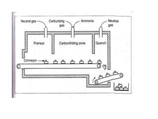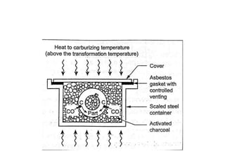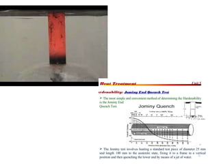 Hardenability refers to a steel's ability to transform to martensite and achieve hardness through quenching. The Jominy end quench test measures hardenability by water quenching one end of a cylindrical steel sample, then measuring hardness levels at intervals from the quenched end. Higher hardness indicates more martensite formation and better hardenability. Case hardening processes like carburizing add carbon to the surface of low-carbon steels to create a hard case while leaving the core tough. Common methods include pack, liquid, and gas carburizing, as well as cyaniding, nitriding, and carbonitriding. Flame and induction hardening also locally harden surfaces through rapid