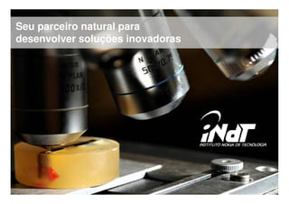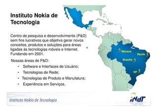 The document summarizes the activities of the Nokia Technology Institute (INdT), a non-profit research and development center in Brazil focused on generating new concepts, products, and solutions related to mobile technologies and the internet. It describes INdT's areas of research like software/interfaces, networks technologies, product/manufacturing technologies, and service experience. It also provides examples of projects in areas like software platforms, network infrastructure, manufacturing optimization, and application development.