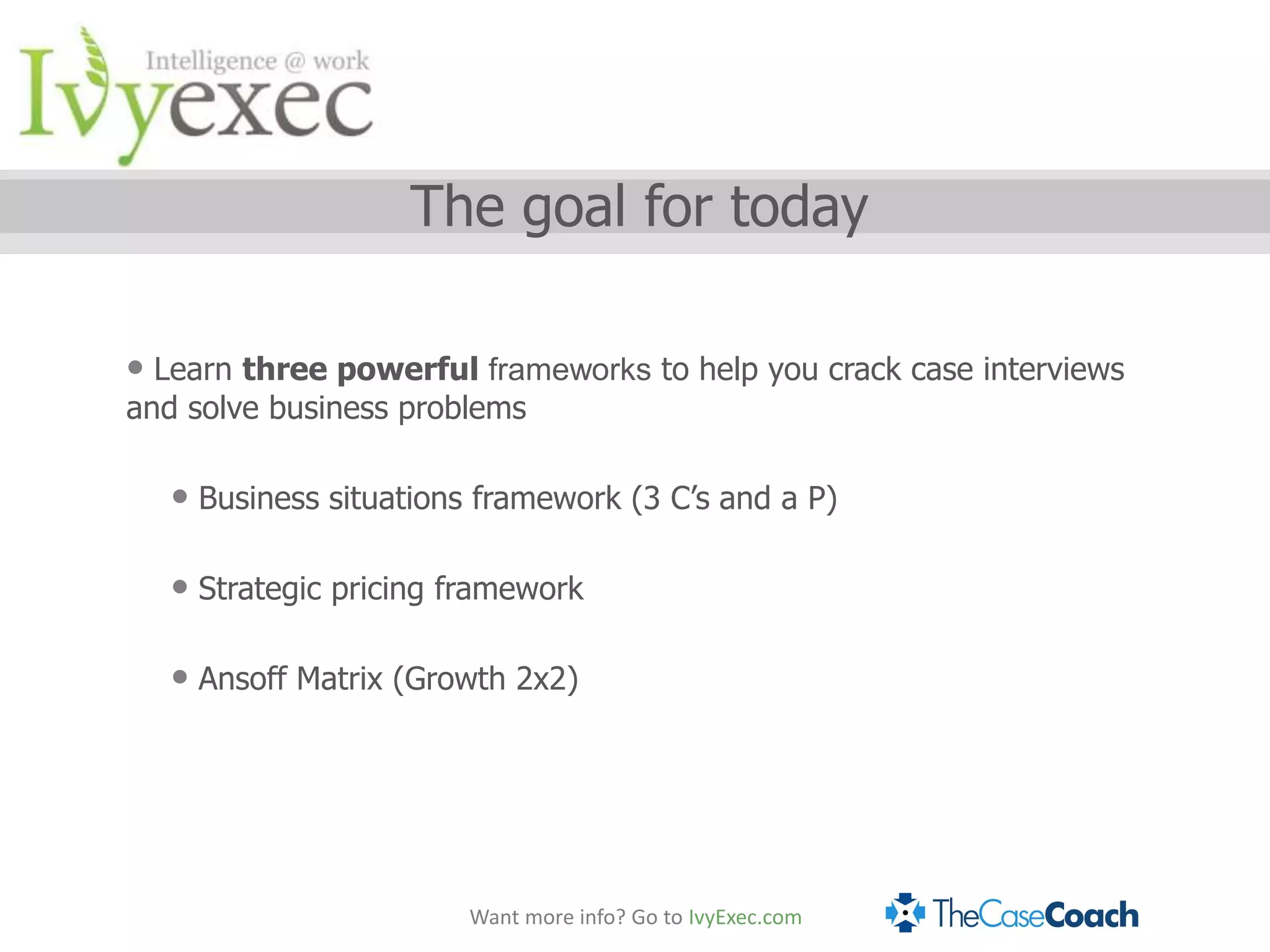 The document provides an overview of case interview frameworks that can be used to solve business problems and crack case interviews. It introduces the Business Situations framework (3 C's and a P), Strategic Pricing framework, and Ansoff Matrix (Growth 2x2). Examples are given to illustrate how each framework can be applied. The presenter's background in consulting and case interview training is also summarized.