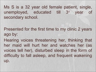 This case presents a 32-year-old female with a long history of psychotic symptoms including auditory hallucinations, delusions, disorganized behavior, and mood changes. Her symptoms did not respond well to various antipsychotic treatments. Further history revealed complex partial seizures. Imaging showed right mesial temporal sclerosis. After discontinuing antipsychotics and treating only with antiepileptics, her symptoms improved, suggesting her psychosis was likely secondary to her underlying epilepsy from mesial temporal sclerosis rather than a primary psychotic disorder. Mesial temporal sclerosis is a common cause of treatment-resistant epilepsy and associated interictal psychosis.